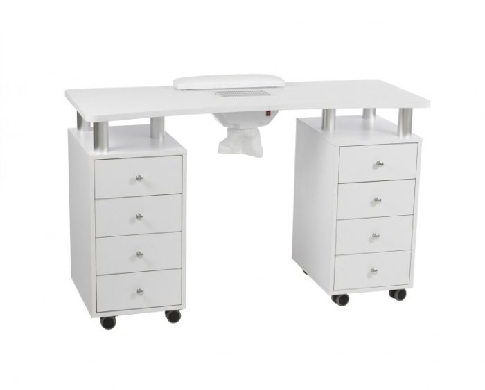 Tavolino da manicure in legno di colore bianco, sacchetto e cuscino poggiamani. Dotato di due colonne con cassetti. Ruote incluse.